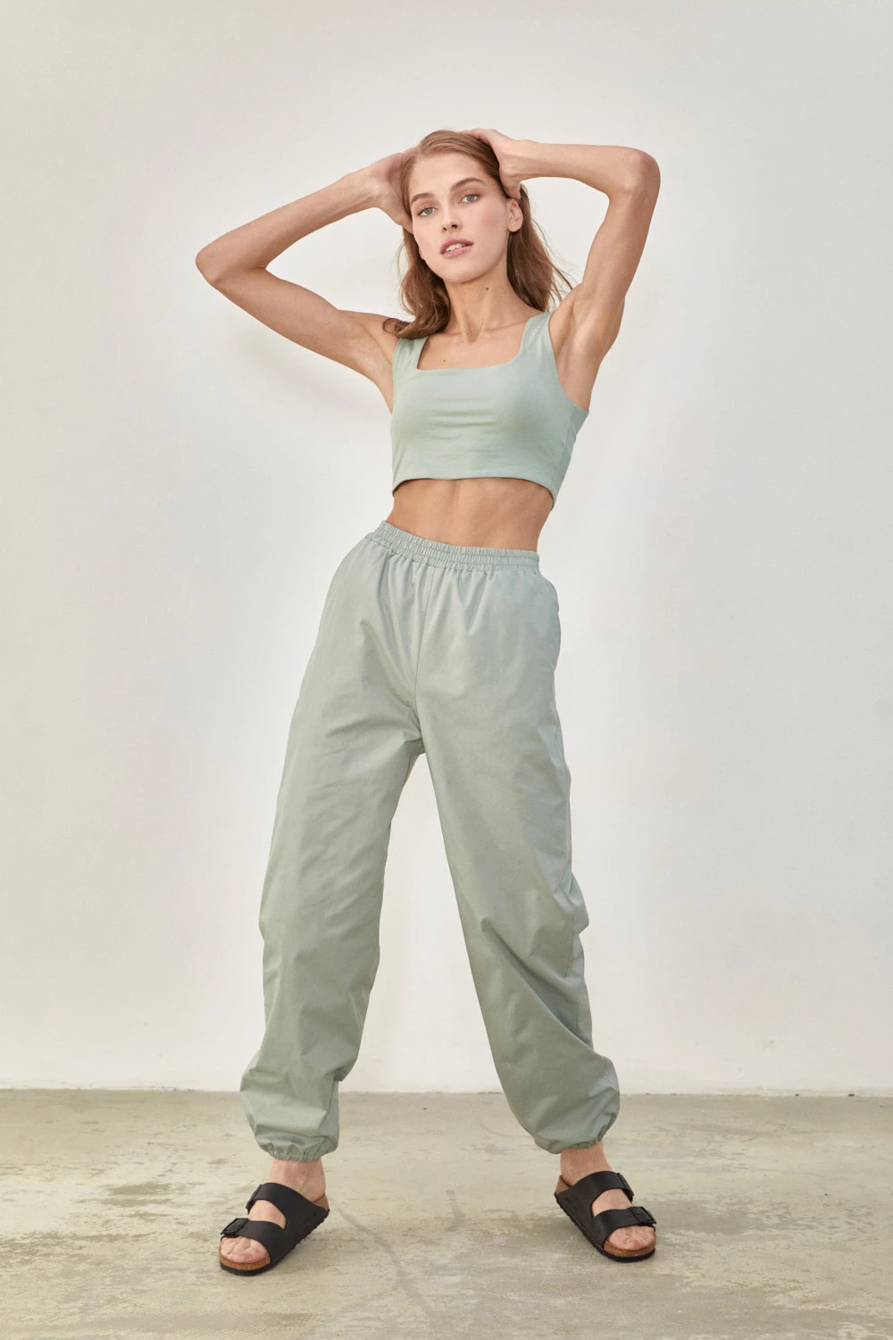 Брюки с посадкой на линии талии. Эластичная тесьма по поясу и низу брюк, функциональные карманы по бокам.