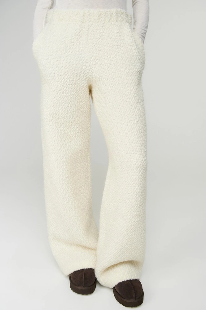 Прямые брюки из искусственного меха с высокой посадкой. Мягкий пояс на резинке обеспечивает комфортную посадку.