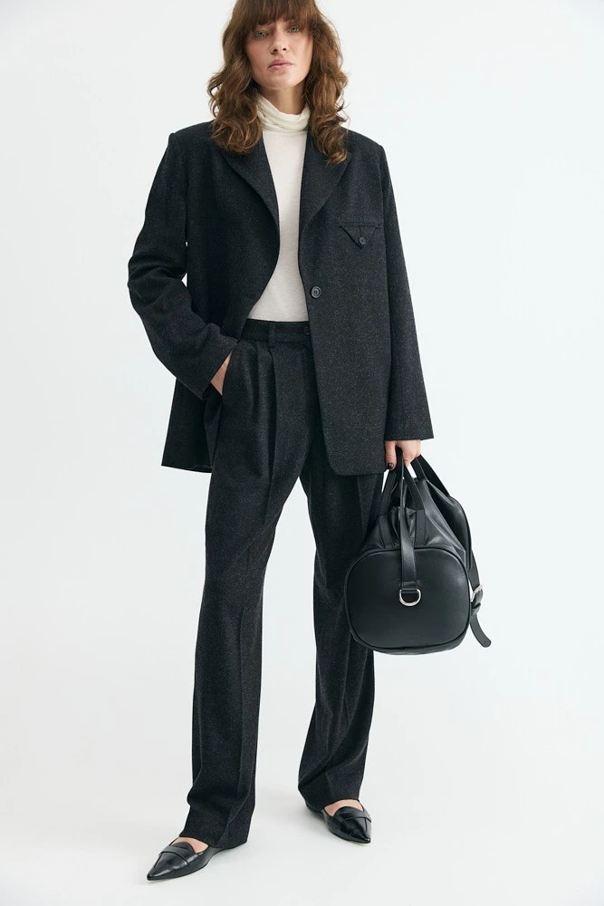 Трендовая модель брюк с посадкой ниже линии талии. Стрелки комплементарно вытянут силуэт. Брюки заужены книзу, что позволит создать актуальный деловой образ как с каблуками, так и с плоским ходом.