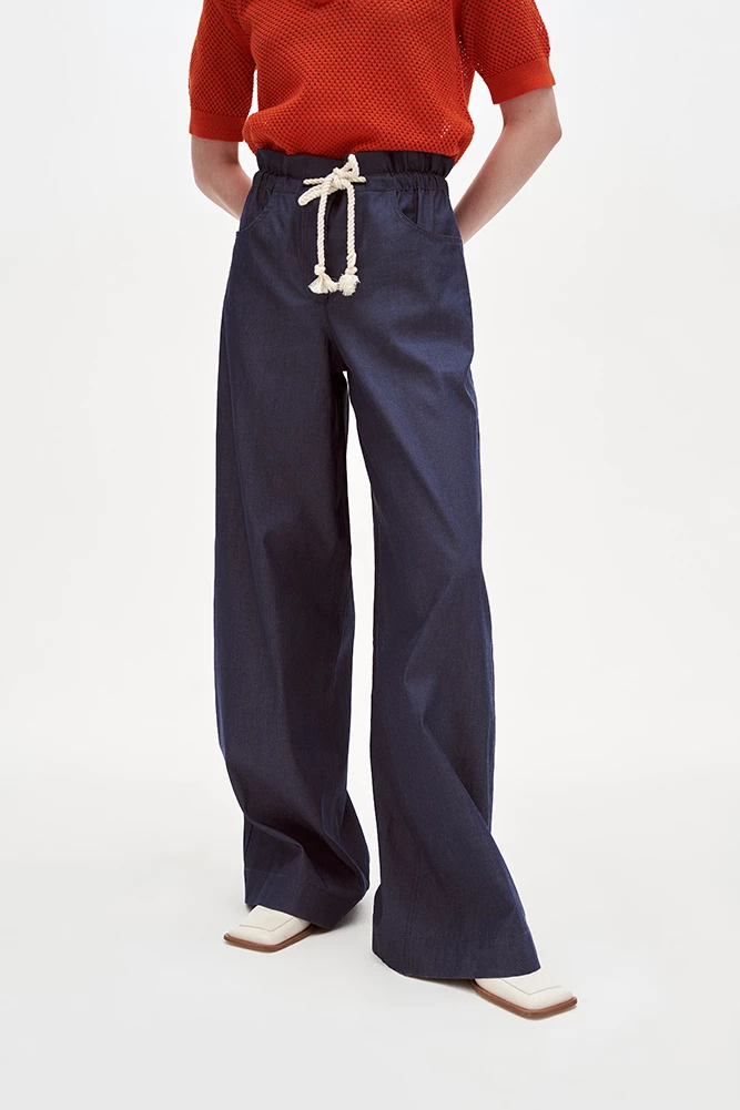 Мягкие джинсы свободного кроя с высокой посадкой. На поясе декоративный контрастный шнур, который поможет скорректировать комфортную посадку по талии.