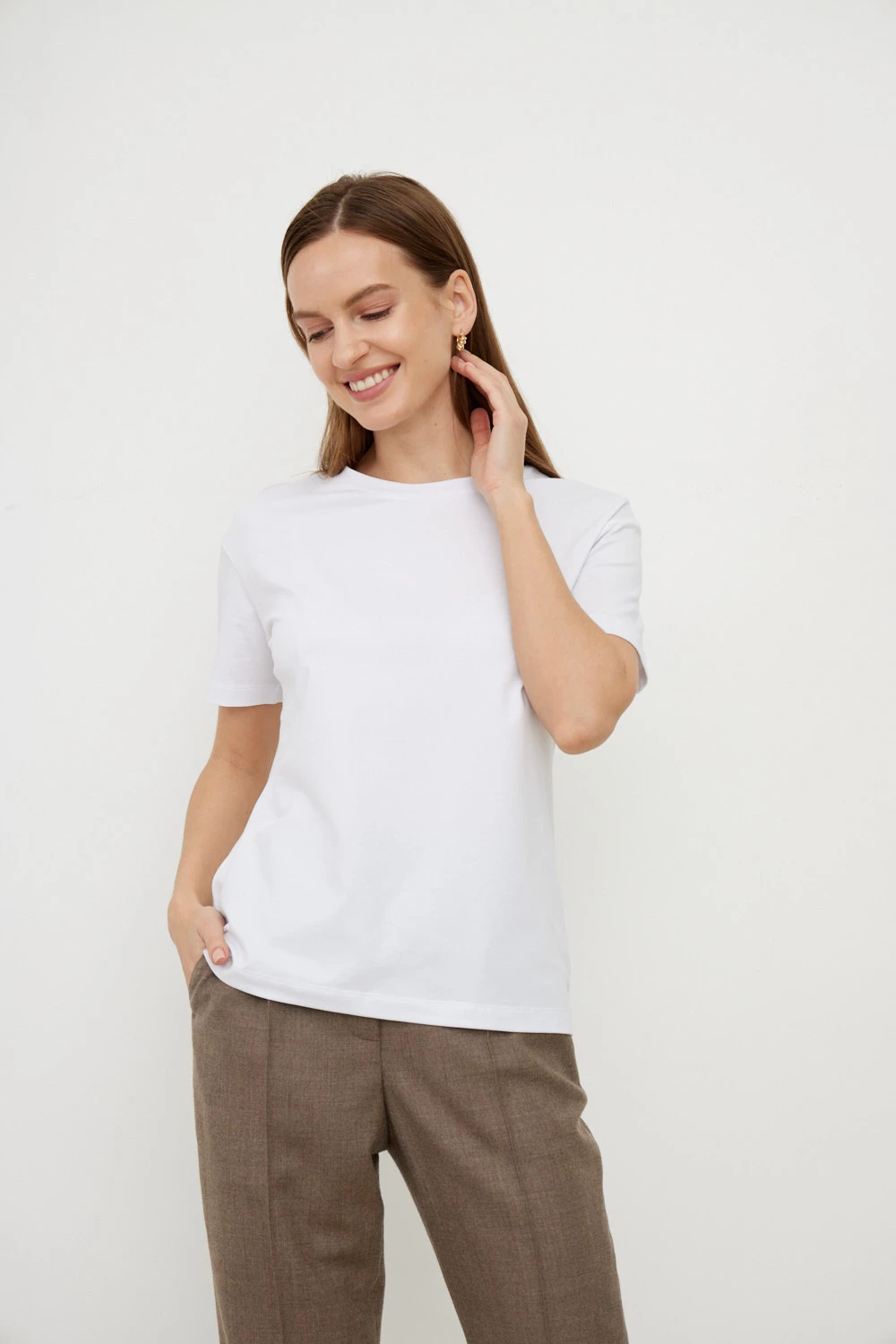 Хлопковая футболка полуприлегающего силуэта - основа для ваших образов. Выбирайте любимые цвета и создавайте комфортные образы каждый день.