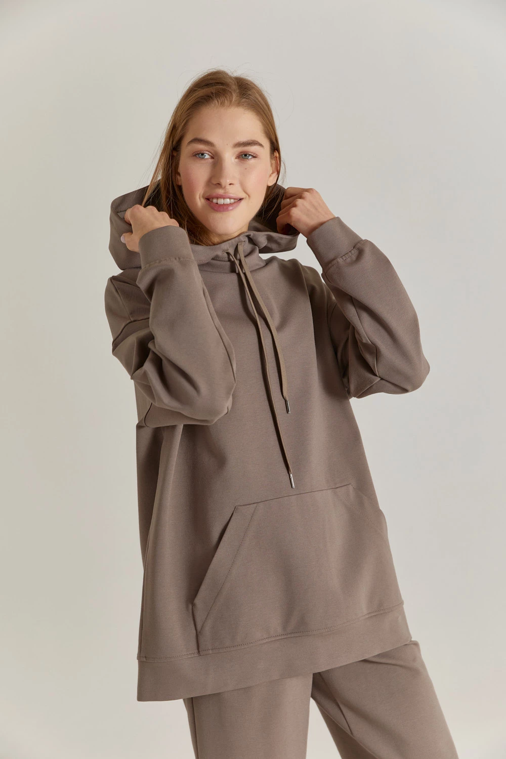 Худи трикотажный удлиненный с капюшоном анорак, свободного кроя, спущенная линия плеча, рукав отрезной с притачной манжетой по низу, накладной карман на полочке, по низу притачной пояс, в капюшон вставлен шнур.