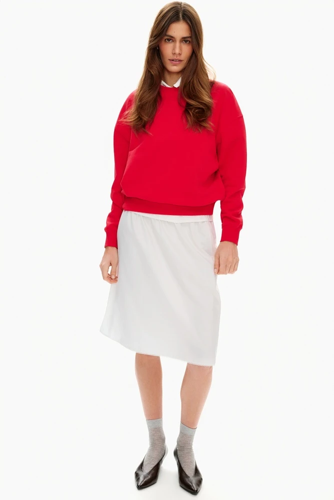Если вы не представляете свои образы без расслабленных позиций, то свитшот из мягкого хлопка станет его незаменимой частью. Круглая горловина, свободный крой и спущенное плечо становятся основой для комфортных повседневных комплектов.
