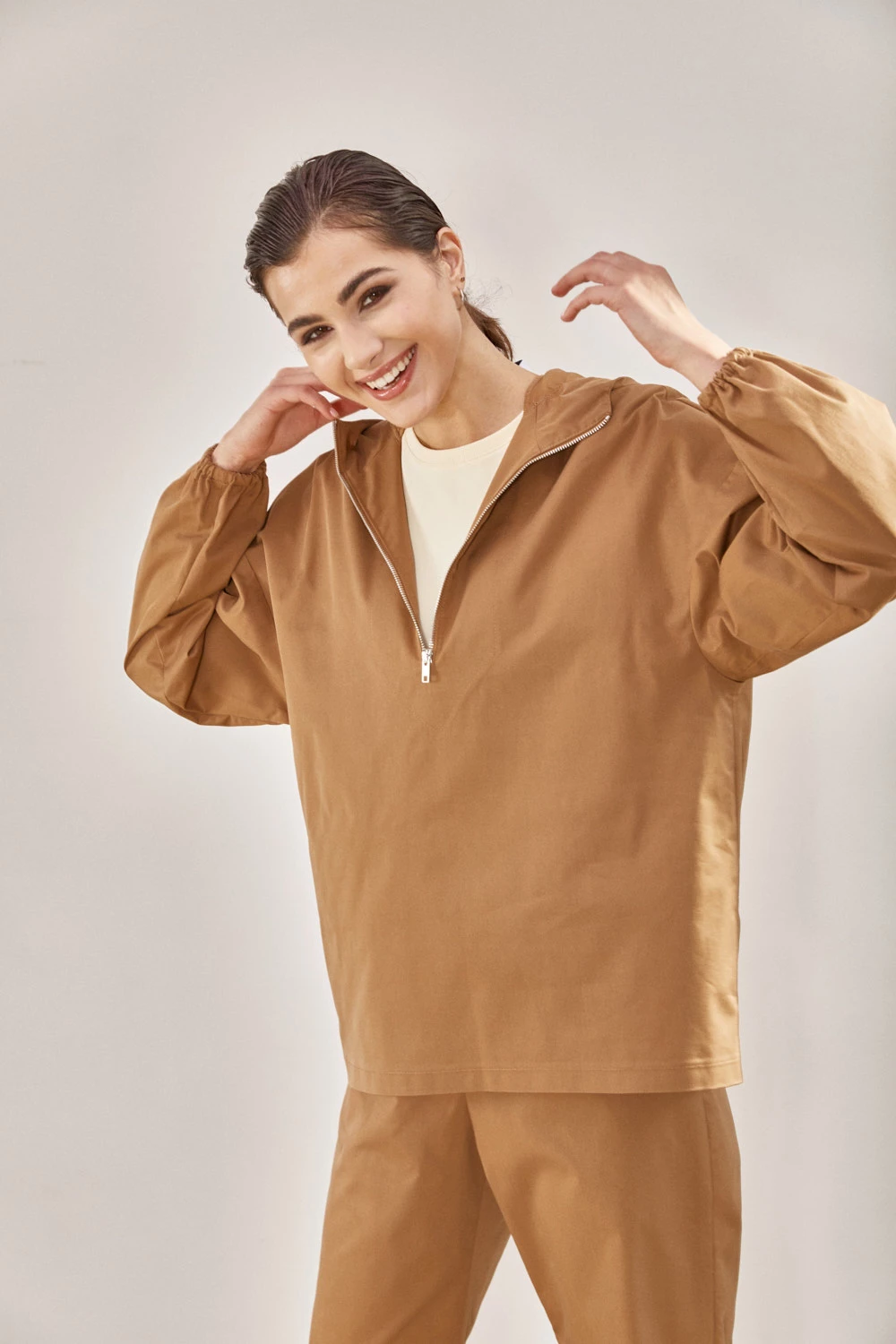 Свитшот прямого силуэта с капюшоном анорак. Спущенная линия плеча, рукав с эластичной тесьмой по низу.