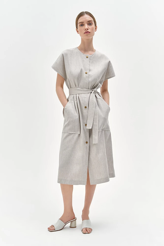Платье женское, прямого силуэта, линия плеча спущенная, горловина круглой формы, застёжка центральная на кнопки, на полочке накладные карманы, пояс съёмный, длина платья миди.