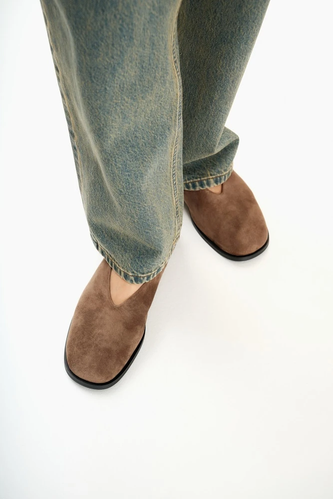 Лаконичные туфли из мягкой натуральной замши — универсальная модель для повседневного гардероба. Форма и сдержанный силуэт подчёркивают текстуру материала, а плоская подошва обеспечивает комфорт на каждый день. Туфли легко сочетаются с базовыми образами и подходят как для города, так и для более спокойных, собранных сочетаний.