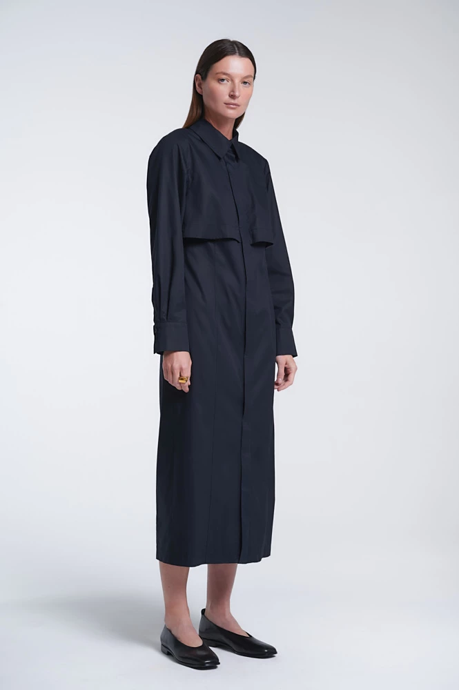 Платье-рубашка длины миди полуприлегающего силуэта. Элегантная модель для ценительниц четких линий. Отлетная кокетка и рубашечный воротник задают основу структурному образу. Вам останется добавить характерных деталей.