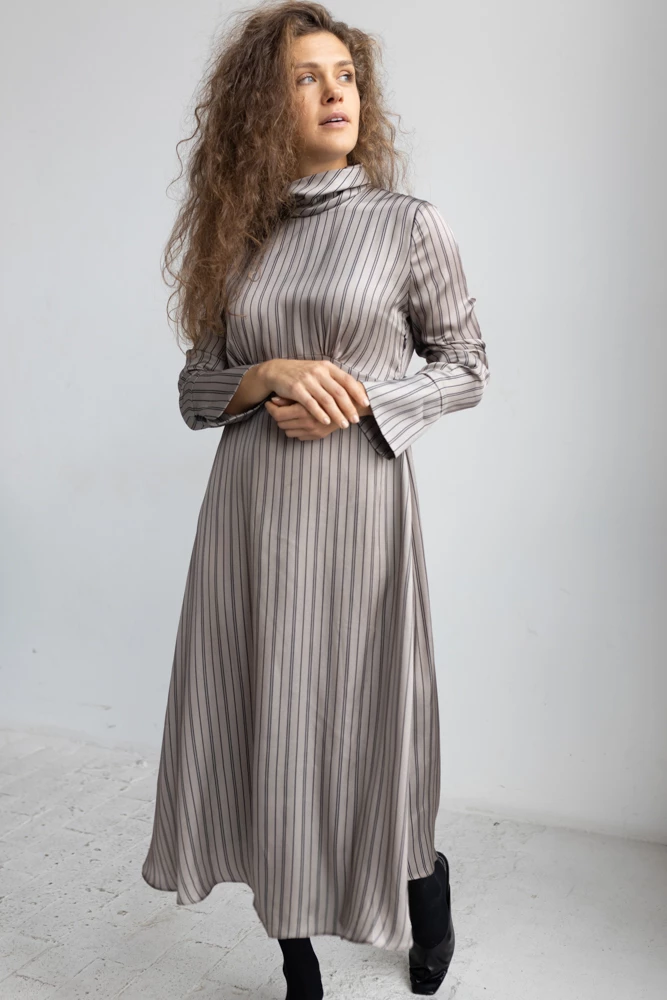 Платье женское, трапециевидного силуэта, с умеренным прилеганием по талии, с фигурным подрезом по лифу спинки и полочки, лиф спереди со сборкой, по спинке застёжка на петли и пуговицы, воротник стойка с драпирующимися складками, рукав втачной по низу притачная манжета с застёжкой на петли и пуговицы, застежка в левом боковом шве на потайную молнию, длина платья макси.
