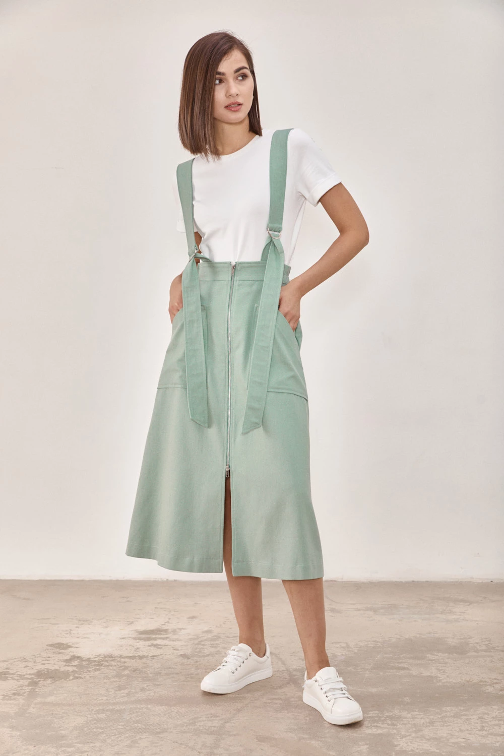 Сарафан трапециевидного силуэта длины миди на регулируемых лямках. Плотная посадка на талии и накладные карманы на передней части. Акцентная застежка-молния.