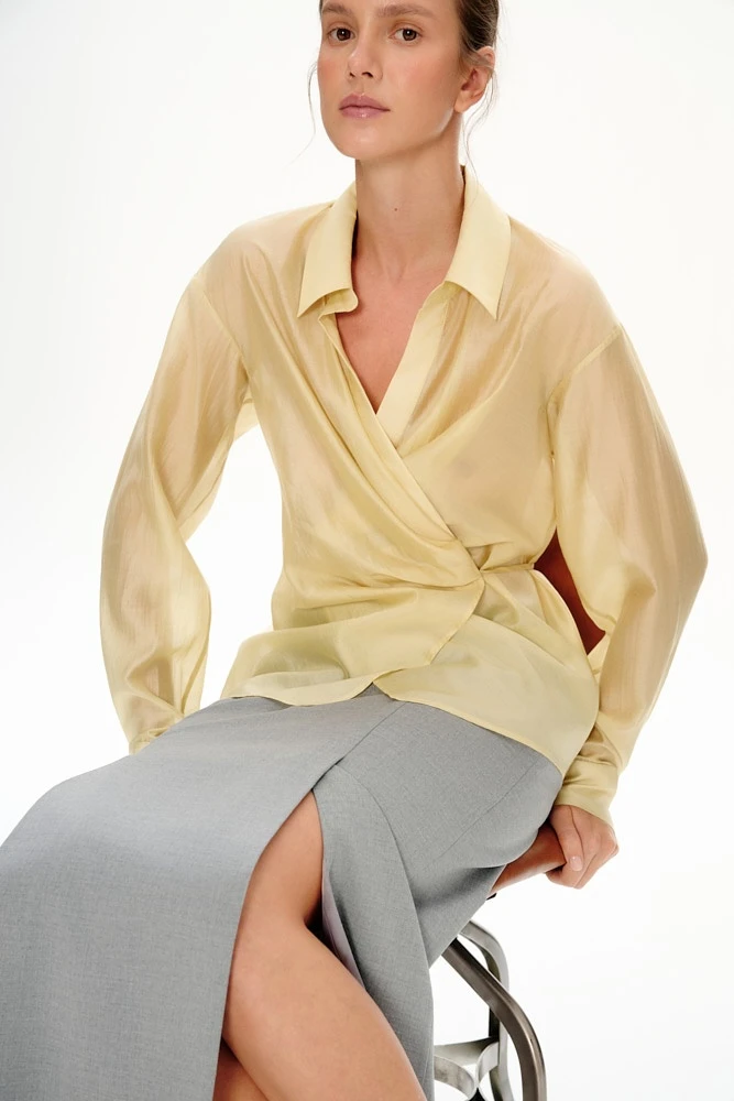 Блуза на запахе с мягкой драпировкой. Воздушный силуэт создаёт лёгкую форму и сохраняет свободу движения. Полупрозрачный материал мягко отражает свет и освежает портретную зону.