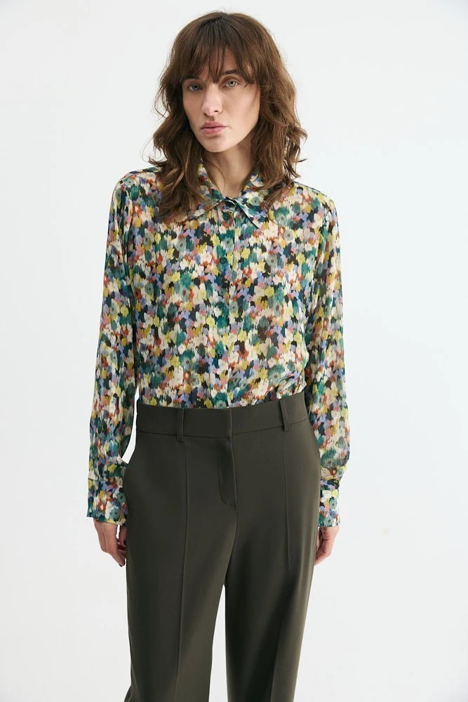 Рубашка свободного кроя из струящейся вискозы. Классическая форма, воротник рубашечного типа и манжеты гармонично сочетаются с ярким принтом.