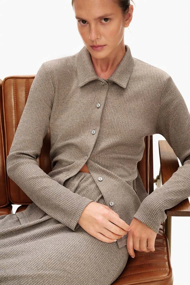 Эта трикотажная рубашка в дуэте с юбкой создают эффектный образ в стиле минималистичных 90х. Простота, элегантность и комфорт - главные качества этой модели. Оттенок тауп подчёркивает универсальность и делает рубашку частью базового гардероба.