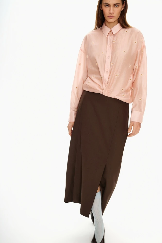 Лёгкая блуза свободного силуэта из полупрозрачной ткани с вышивкой. Мягкий розовый оттенок и отложной воротник формируют спокойный, женственный образ. Блуза легко вписывается в повседневные и многослойные образы.