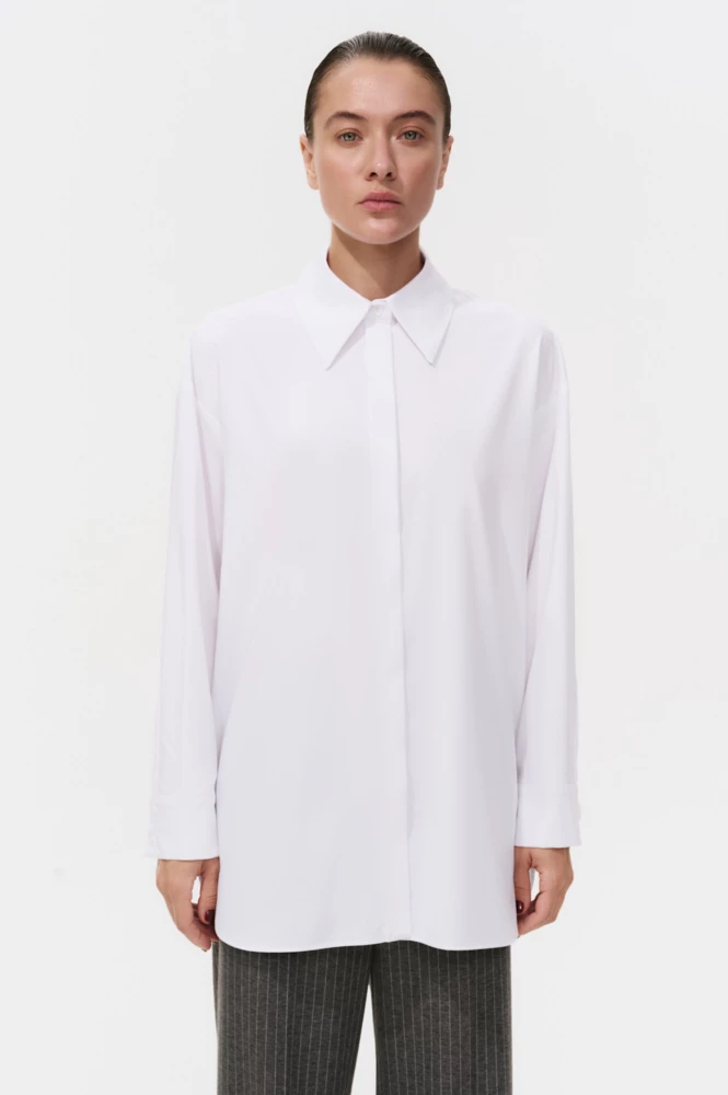 Рубашка прямого силуэта из костюмной ткани с супатной застежкой. Концы воротника удлиненные, а по боковым швам разрезы с закругленными концами, благодаря им, рубашку можно носить навыпуск.