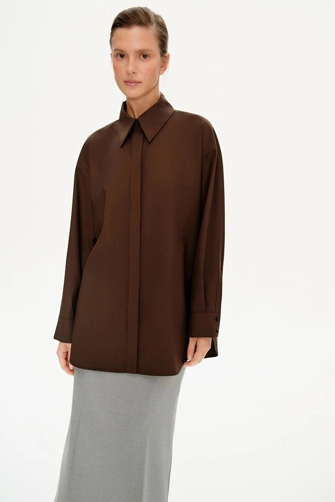 Рубашка прямого силуэта из костюмной ткани с супатной застежкой. Концы воротника удлиненные, а по боковым швам разрезы с закругленными концами, благодаря им, рубашку можно носить навыпуск.