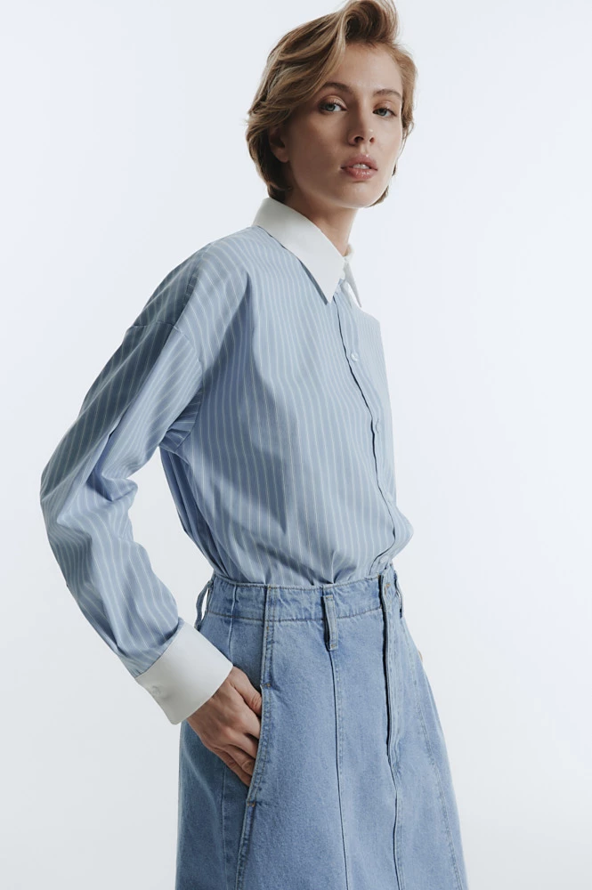 Рубашка свободного силуэта с воротником и манжетами из контрастной ткани. По бокам рубашки разрезы с закругленными концами, благодаря им, рубашку можно носить навыпуск.