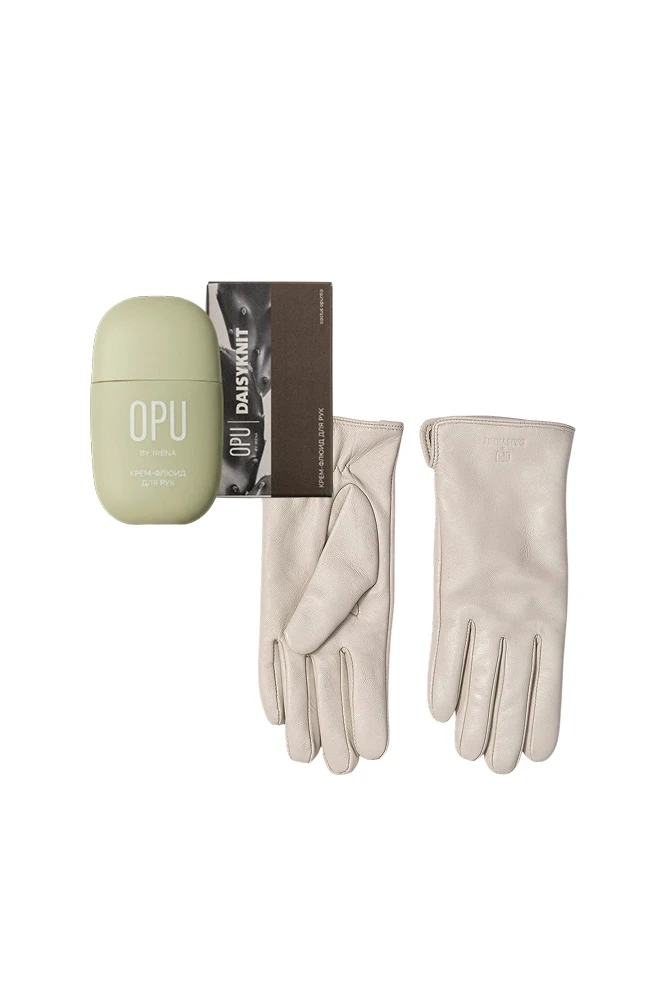 кожаные перчатки в универсальном природном оттенке и крем-флюид для рук, созданный для ежедневного ухода.