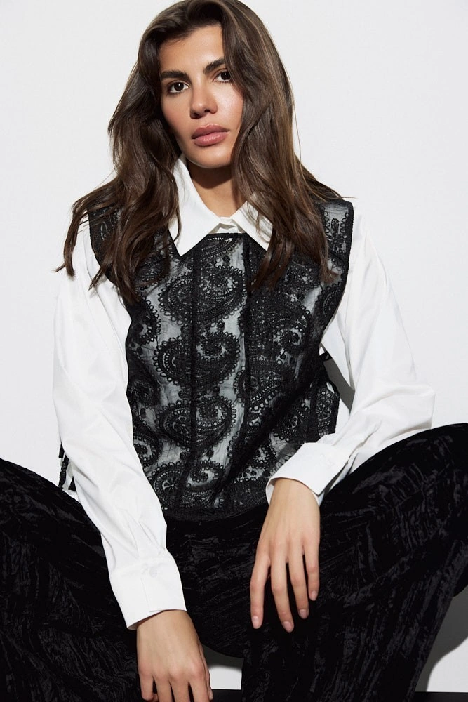Кружевная манишка — изысканный акцент, добавляющий образу утончённость и графичность. Изделие выполнено из ажурного кружева с крупным узором “пейсли”, который создаёт выразительную фактуру и подчёркивает сложность ручной работы. Контраст между прозрачной основой и плотным орнаментом придаёт изделию лёгкость и глубину. Манишка имеет прямой силуэт и аккуратную посадку по фигуре, фиксируется при помощи тонких завязок по бокам, что позволяет регулировать ширину и комфортную посадку поверх рубашек, платьев или трикотажа.