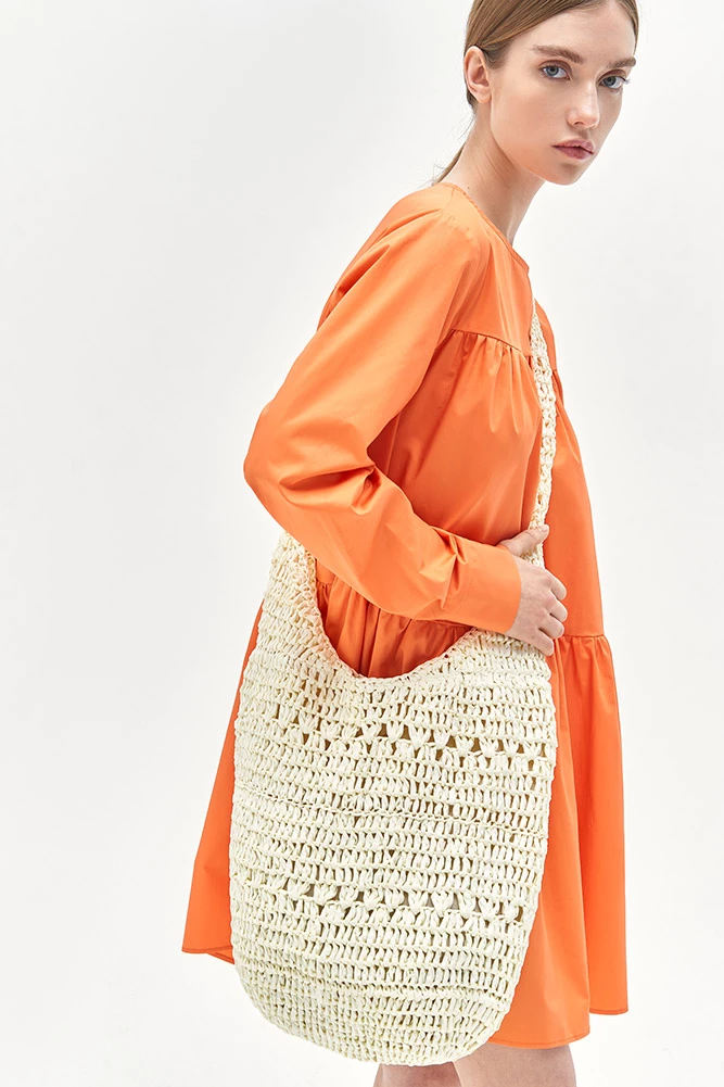 Женская сумка округлой формы на подкладке, имеет одно открытое отделение с застежкой на кнопку.