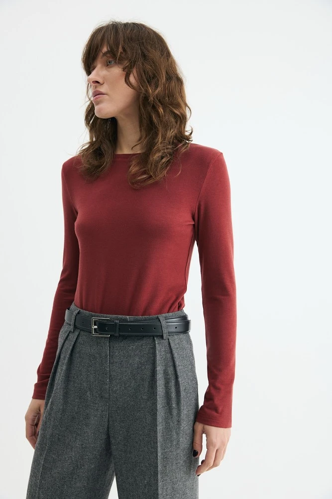 Минималистичный лонгслив облегающего силуэта из тонкого трикотажа. Та самая модель, когда хочется создать трогательный, но утепленный комплект. Предлагаем использовать его в качестве первого слоя в сложных многослойных комплектах.