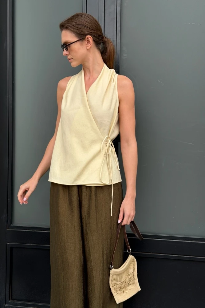 Лён с выраженной фактурой, но при этом мягкий и приятный на ощупь. Вырез халтер всегда смотрится элегантно и, за счёт открытых плеч, соблазнительно. Такой топ даже в будничных комплектах выглядит женственно и мягко, но уверенно подчёркивает свою обладательницу.