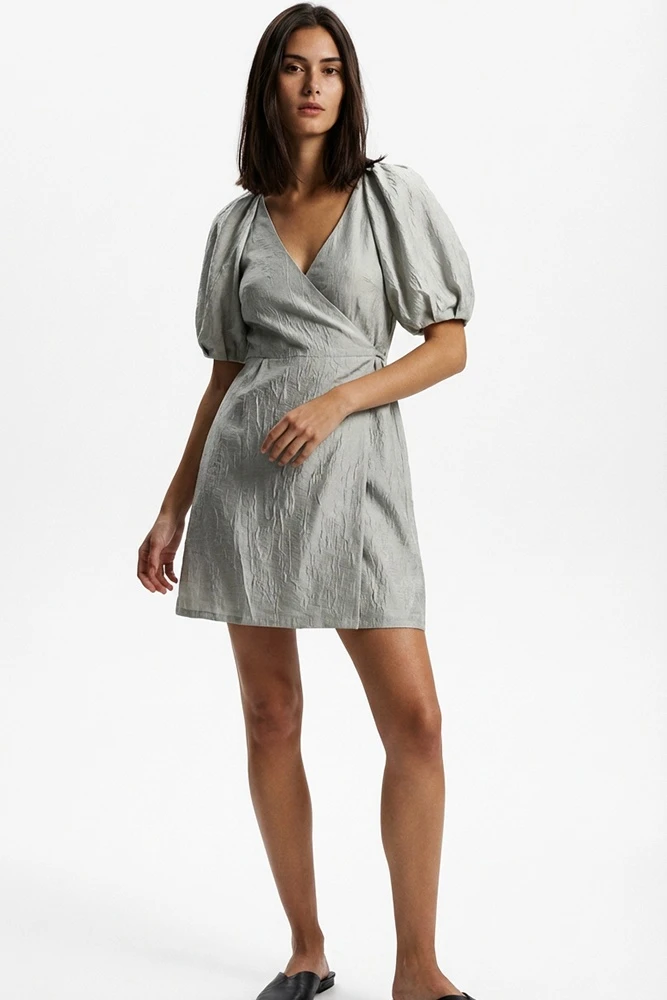 Легкое платье на запахе в длине мини. Благодаря фактурной ткани платье выглядит эффектно и не требует дополнительных аксессуаров.