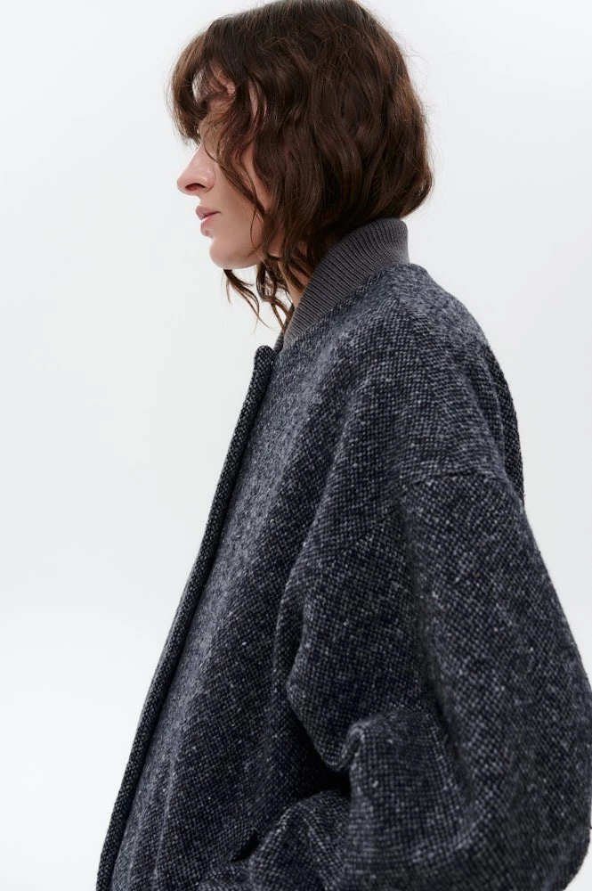 Объемный бомбер с расширенной линией плеча из фактурного драпа. Чтобы весенние образы были гармоничными, мы сделали его длину ниже линии бедра.