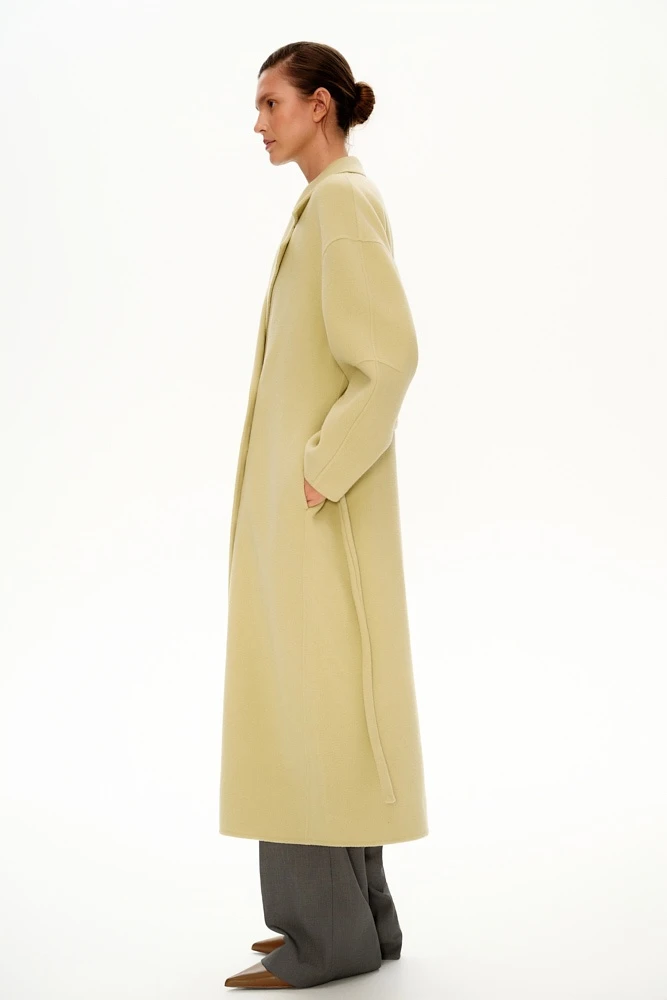 Изысканный силуэт, построенный на чистой линии и мягкой драпировке, подчеркивает утонченность вкуса и естественную женственность. Пояс формирует безупречный акцент на талии, позволяя менять настроение образа от расслабленного до подчеркнуто элегантного. Высококачественная шерсть дарит мягкое тепло и лёгкость, сохраняя изящность формы. Это пальто создано для тех, кто выбирает сдержанную роскошь и уверенность, выраженную в лаконичности.