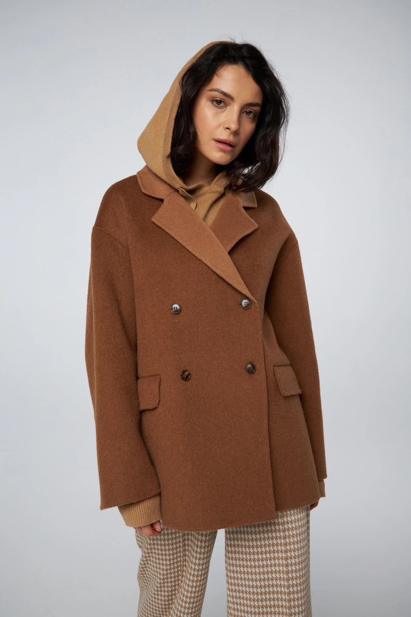 Пальто женское двубортное укороченное, без подклада, прямого силуэта, спущенная линия плеча, рукав втачной двухшовный с разрезом по низу, воротник английский отложной, застежка центральная на петли и пуговицы, на полочке карманы в листочку с клапаном.