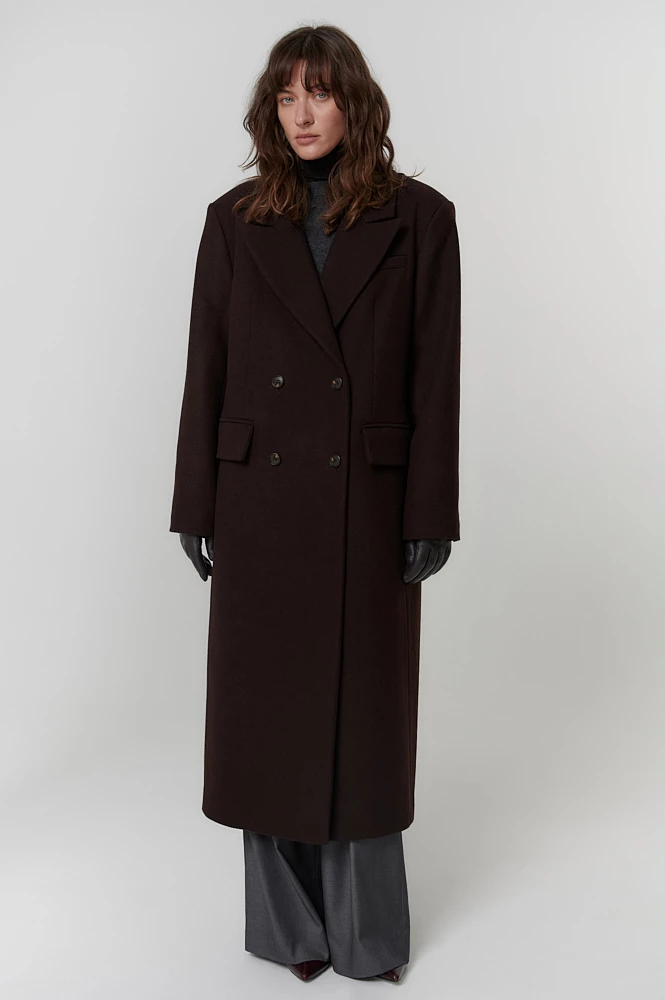 Прямое двубортное пальто длины макси с утеплителем. Пожалуй, самая универсальная модель: английский воротник, два ряда пуговиц и свободный крой дают простор для фантазии и сочетаний.