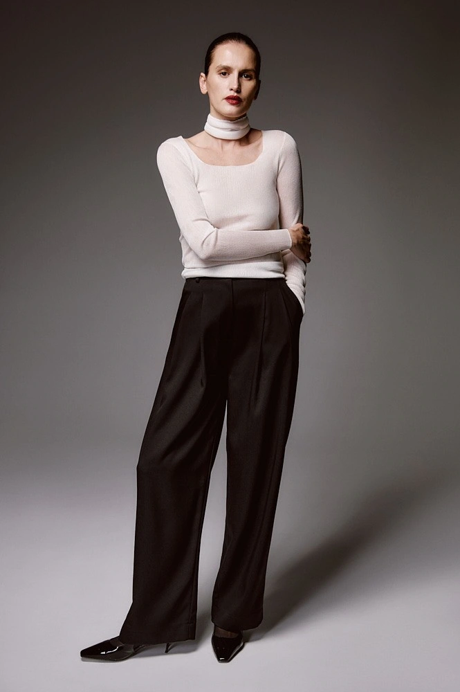 Джемпер с квадратным вырезом и съемной высокой горловиной тонкой полупрозрачной вязки. Длинный рукав, прилегающий силуэт и длина выше линии бедер создают основу для многослойных комплектов.