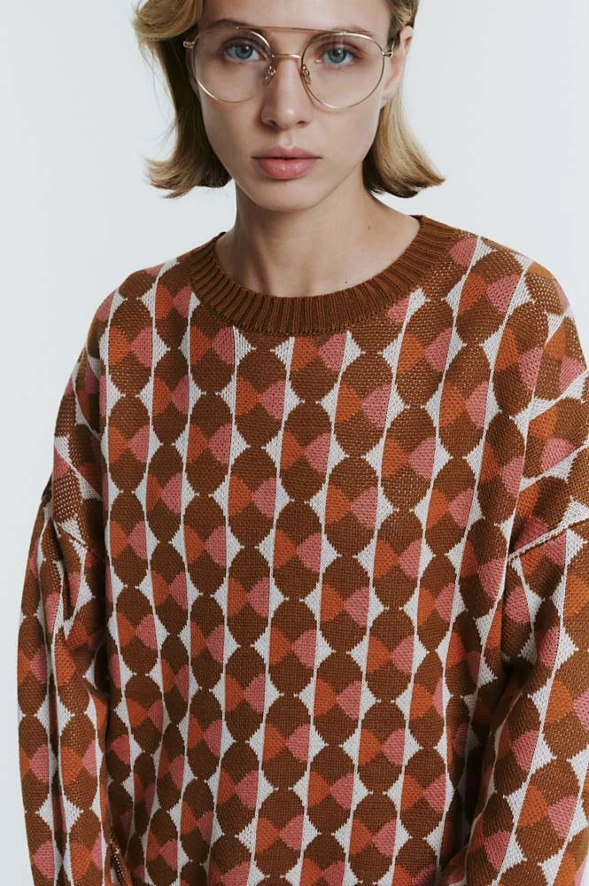 Джемпер оверсайз с круглой горловиной и спущенным рукавом. Благодаря оригинальному орнаменту, образы становятся яркими.
