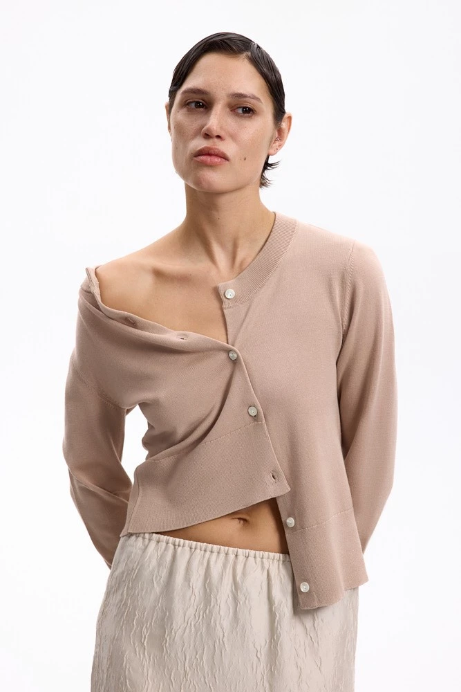 Укороченный мягкий кардиган с застежкой из перламутровых пуговиц. Хлопок и шелк в составе позволят носить его как весной, так и прохладным летом.