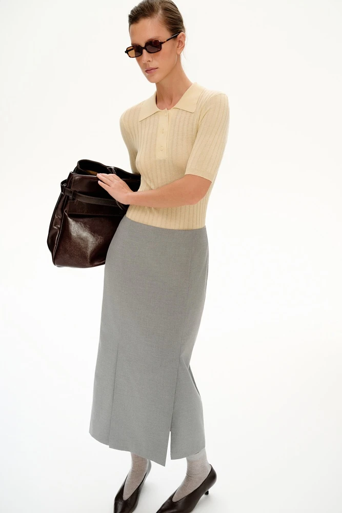 Любимое поло вернулось в новых оттенках. Короткий рукав и фактурная вязка гармонично сочетаются с изделиями из новой коллекции.