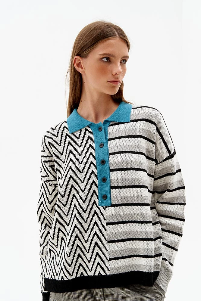 Трикотажный свитер-поло с длинным спущенным рукавом и отложным воротником.