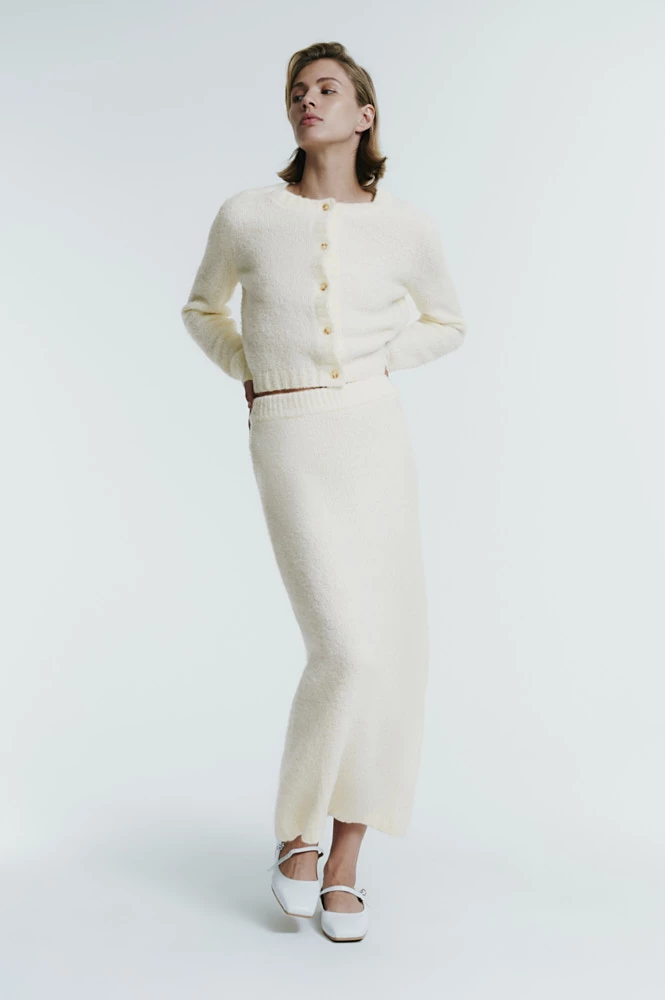 Длинная юбка из мягкой пряжи станет вашей любимой, если вы любите женственные образы даже в холодный сезон. Сочетайте ее с нашим объемным свитером, чтобы собрать нежный образ.