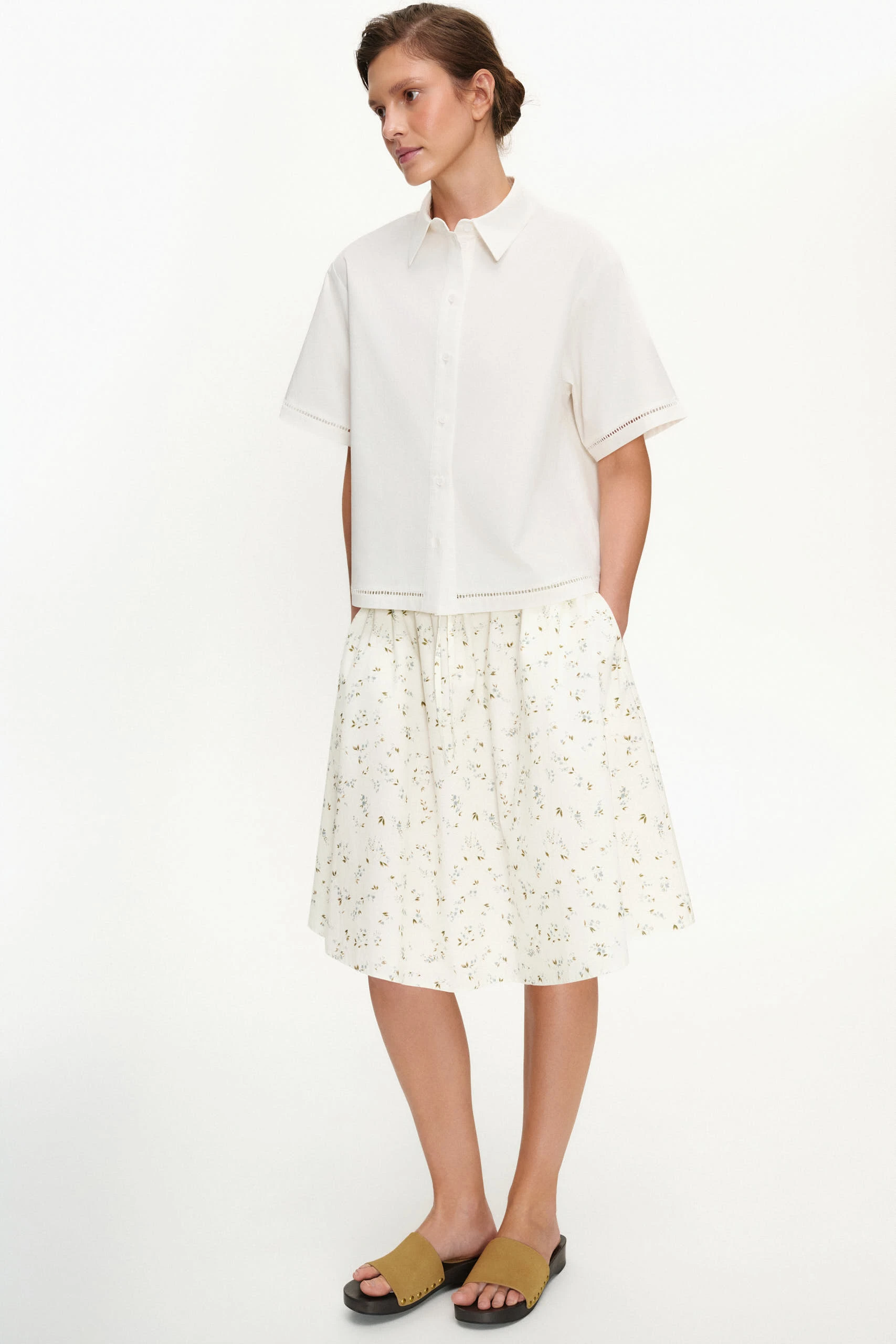 Юбка из натурального хлопка с романтичным рисунком. Модель свежая и актуальная, благодаря длине и контрасту стилей, который в ней заложен. Нежный цветочный принт сочетается с резинкой и кулисой, которые вносят спортивную нотку. Юбка освежает образ без лишних усилий и комбинируется с чем угодно: от простой футболки до лёгкой рубашки.