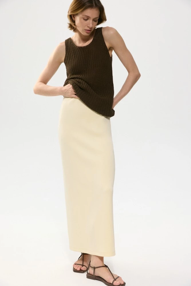 Юбка прямого силуэта в длине макси. Мягкий пояс на резинке и высокая шлица позволяют создавать женственные комплекты для активного дня.