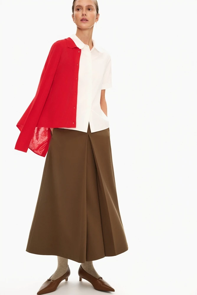 Стильная юбка миди прямого кроя в благородном шоколадном цвете. Минималистичный, но небанальный дизайн. Традиционный А-силуэт дополняется глубокой складкой спереди и несколькими складками по спинке. Посадка чуть ниже естественной завершает современную форму юбки. Модель идеально подходит как для офиса, так и для повседневных выходов.