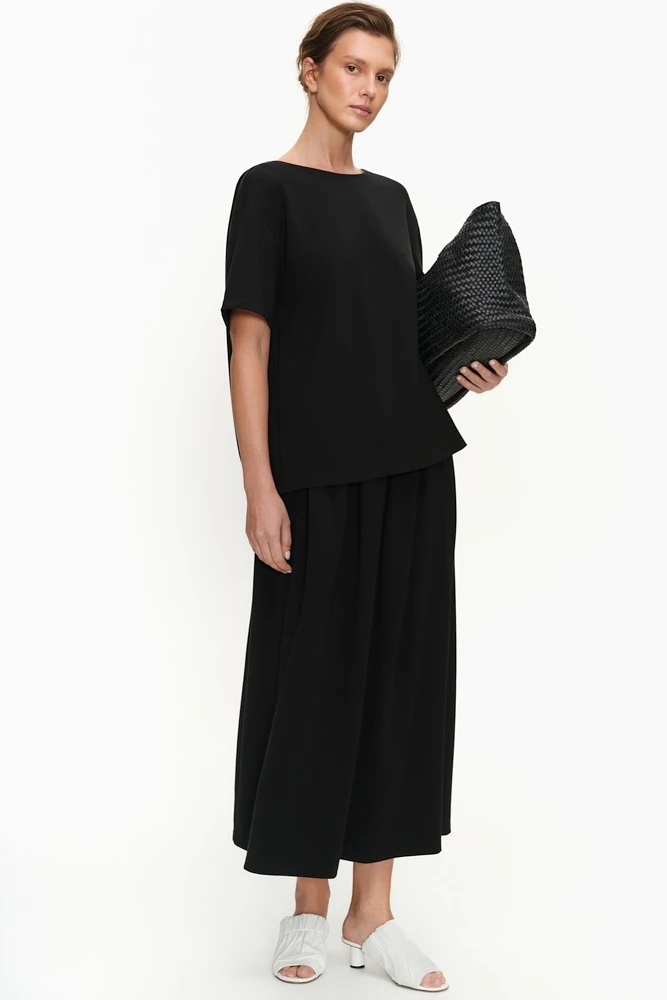 Юбка миди из трикотажа с добавлением шёлка — универсальная вещь для любого сезона. Мягкая ткань приятно ощущается на теле и красиво драпируется. Удобная посадка на резинке не сковывает движений, а полная длина делает юбку подходящей для самых разных образов — от повседневных до более строгих. Легко сочетается с базовыми топами, рубашками и жакетами, добавляя в гардероб нотку элегантной расслабленности.