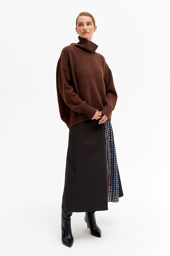 Юбка длинной миди, трапецевидного силуэта с подкройным поясом. Застежка на молнию и потайную пуговицу в боковой шве. На передней половинке юбки струящаяся вставка.