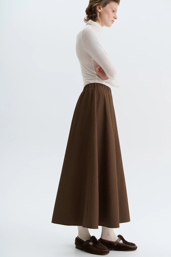 Лёгкая юбка миди из фактурной плащевой ткани, в которой практичность объединяется со стилем. Непромокаемый материал с тонким слоем утеплителя держит форму и создает красивый силуэт. Эластичный пояс обеспечивает удобную посадку, а лаконичный дизайн делает модель универсальной для повседневных сочетаний.