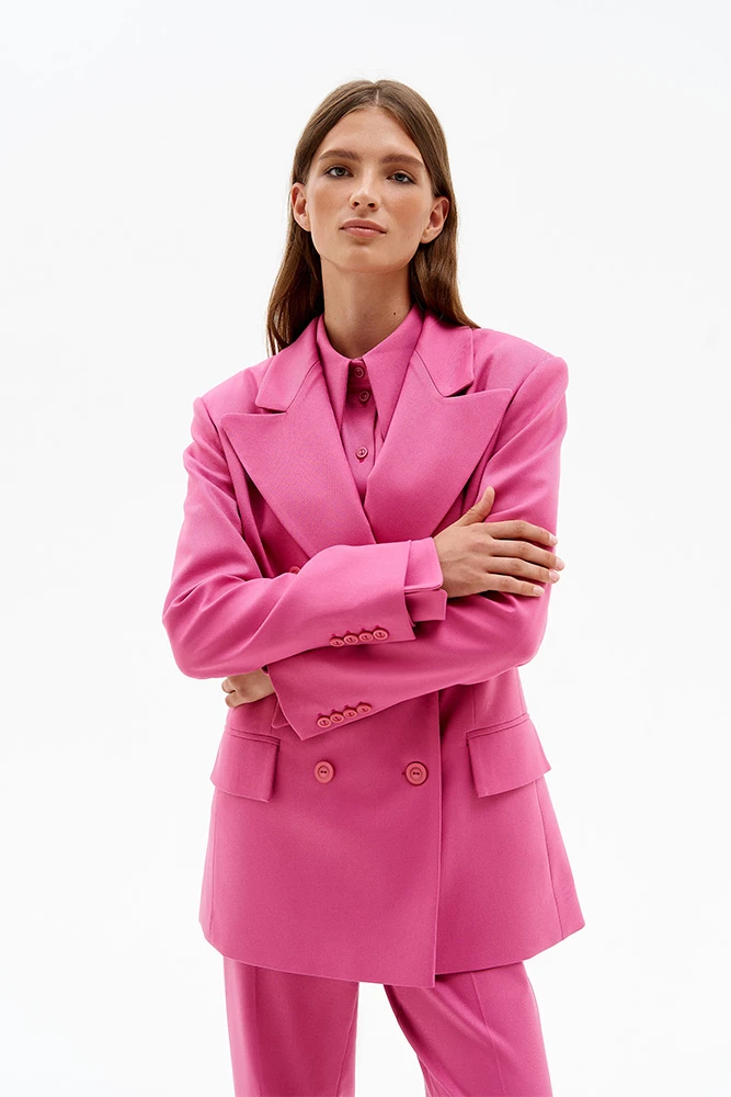 Жакет на подкладке двубортный, прилегающего силуэта, рукав двухшовный втачной со шлицей по низу, воротник английский отложной, застежка на петли и пуговицы, карманы прорезные в рамку с клапанами, слева на груди имитация прорезного кармана с листочкой, в среднем шве спинки шлица. Плечевой пояс расширенный.