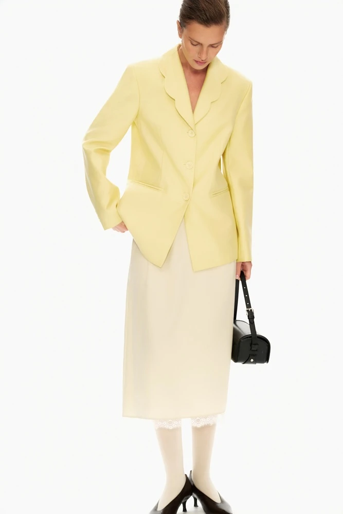 Чтобы сделать образ запоминающимся, иногда достаточно всего одной детали. Жакет с акцентным воротником станет ненавязчивым героем образа и выделит свою обладательницу. Материал и цвет также заслуживают внимания, жакет выполнен из необычной ткани с тенселом и шерстью, мягко отражает свет и выглядит роскошно в свежем желтом оттенке.