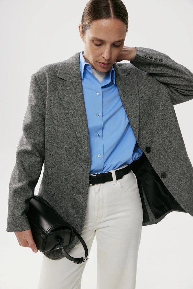 Однобортный жакет свободного кроя из шерсти. Эта модель смело заменит вам верхнюю одежду на весну и станет верным спутником в офисе в прохладные дни.