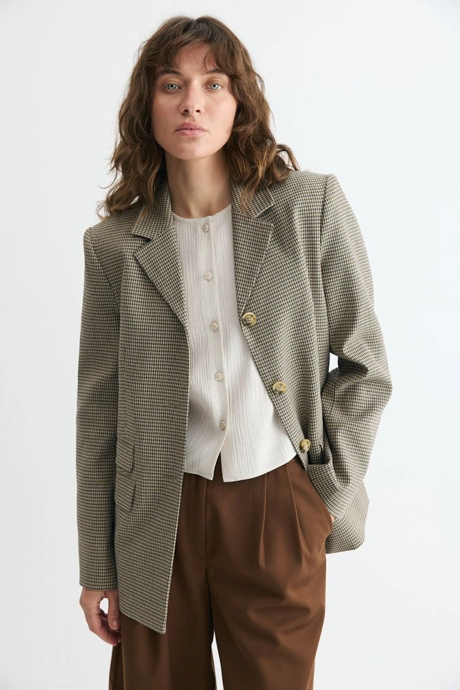 Однобортный жакет полуприталенного силуэта с застежкой на три пуговицы. Новинка идеально дополнит деловой гардероб и добавит в образ элегантности.