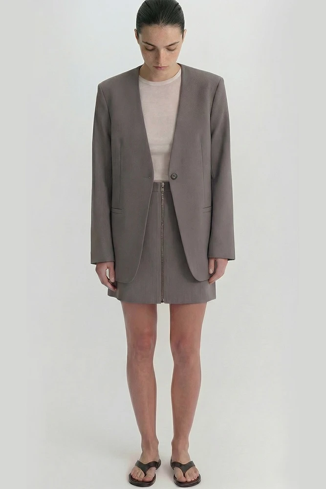 Жакет с закругленными бортами имеет расширенную линию плеча и прямой силуэт, что придает ему современный вид. V-образная горловина застегивается на пуговицу и отлично сочетается с водолазками и лонгсливами.