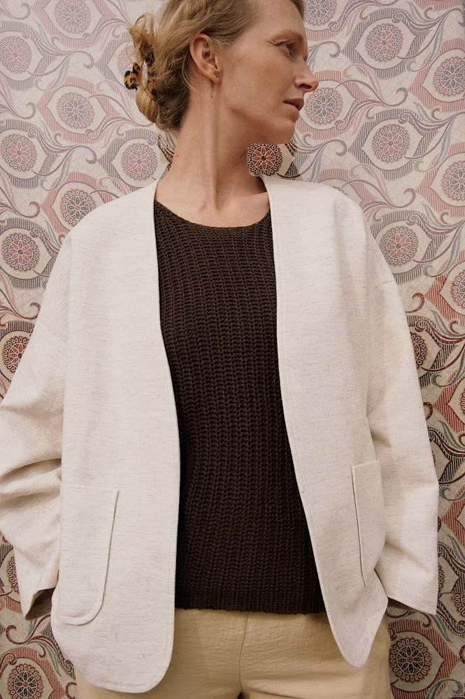 Жакет прямого силуэта из фактурной ткани со спущенной линией плеча. Регулировать объем жакета вы сможете узким поясом, создавая V-образный вырез.