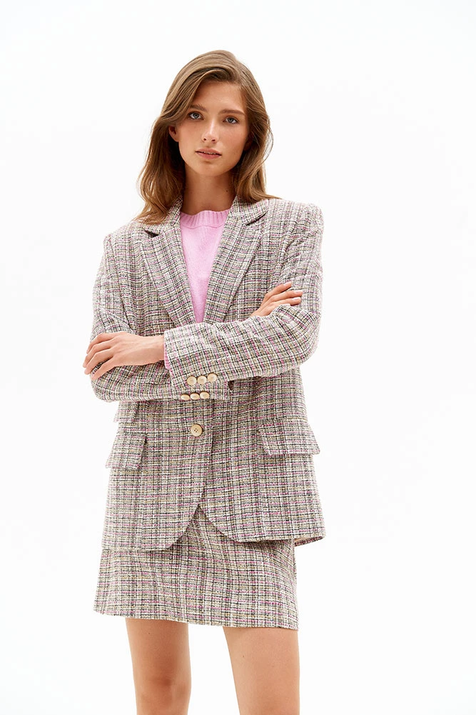 Жакет на подкладке женский однобортный, с расширенной линией плеча, прямого силуэта, борта жакета внизу закруглённые, рукав двухшовный втачной со шлицей по низу, воротник английский отложной с закруглёнными концами, застежка на петли и пуговицы, на полочке накладные карманы в швах с клапаном, на правой полочке декоративный клапан.