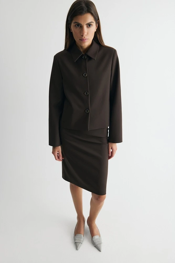 Укороченный жакет с круглой горловиной и отложным воротником. Новая модель позволит создавать строгие, но при этом трендовые комплекты с налетом ретро-эстетики.